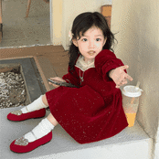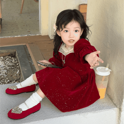 秋冬新作 3-8歳 ガールズ 裏ボア裏起毛 シフトドレス キラキラ フリル ワンピース ベルベット ワンピ 5-13