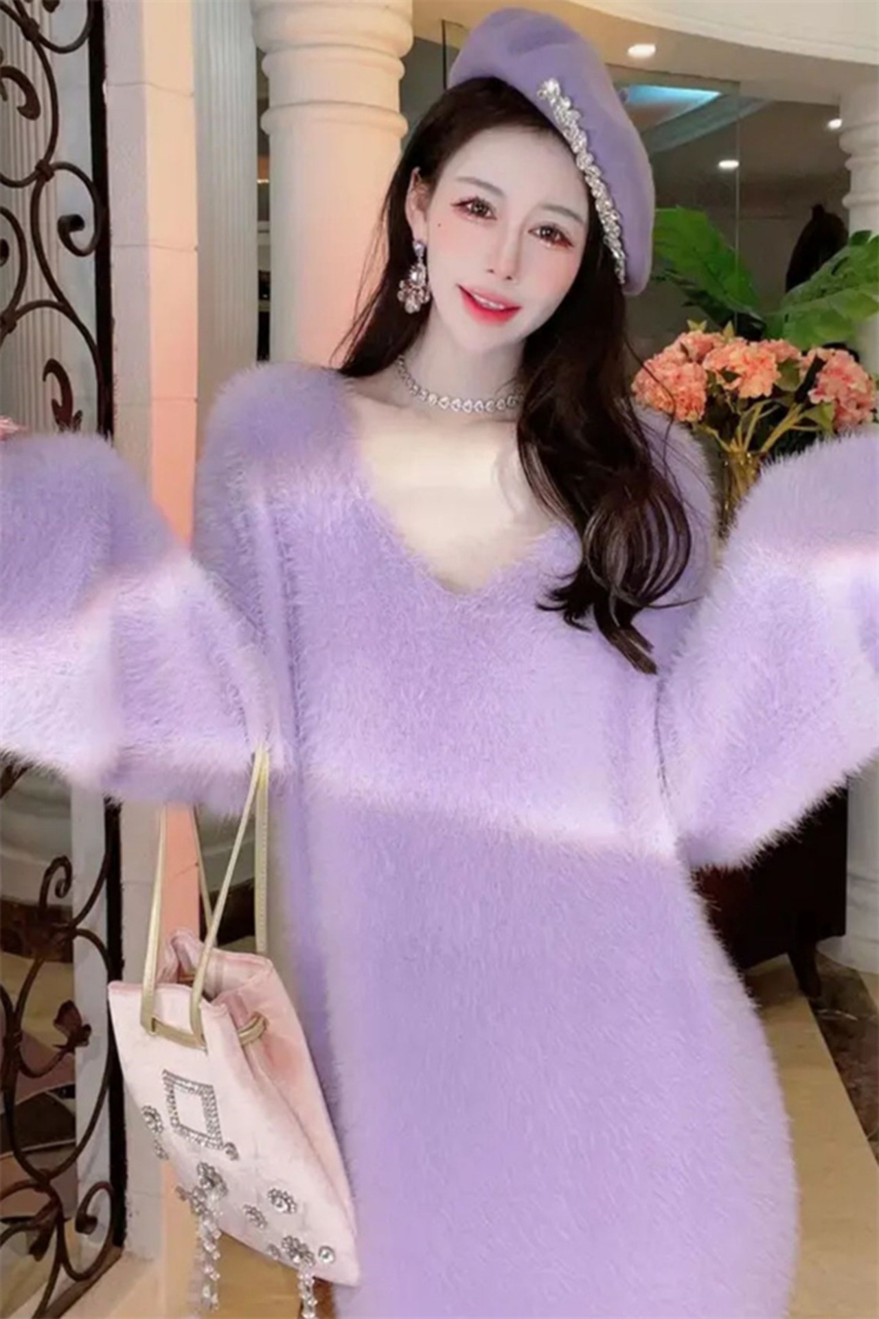 柔らかい Vネック 快適である ロングスカート 大きいサイズ ニットワンピース